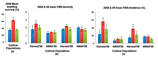 (a) Mean seedling survival; (b) Mean bulb FBR severity; and (c) Mean bulb FBR incidence (%) of NuMex Luna Ori, SS, and MBS populations in 2008 and 2009 evaluations. Std. error is shown on top of each bar. Grouping legend is provided in Figure 2. (*) Significantly different from original at P = 0.05.