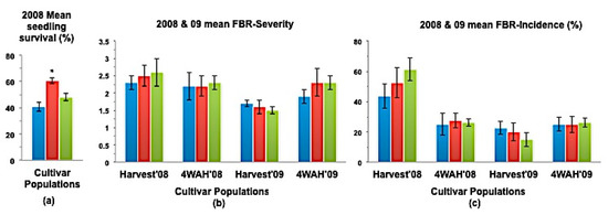 This study revealed that the field screening method is not an efficient method either to increase FBR resistance among the selected cultivar populations or to evaluate the progress that was made using either screening method (Figure 2, Figure 3, Figure 4, Figure 5, Figure 6 and Figure 7). A lack of progress among the field-selected populations was confirmed by their low seedling survival for most of the cultivars during seedling evaluations (Figure 2a, Figure 3a, Figure 4a, Figure 6a and Figure 7a). Disease severity and incidence results of the selected cultivar populations through the field inoculation screening were very inconsistent at harvest, four weeks after storage, and between two consecutive years. These inconsistent results make it difficult to determine if the selection was ineffective for making progress or if the evaluation method was ineffective for assessing the level of FBR resistance found in this germplasm. Even though a very high amount of FBR incidence was reported earlier in the FGSC fields [32], the FOC spore distribution has been shown to be non-random and not uniform throughout a field [23]. With this field distribution of the pathogen, it is unknown whether bulbs are coming in contact with the pathogen or not. Additionally, the lack of favorable disease-causing environments under field conditions in different years could also result in inconsistent FBR infestation and generate a false interpretation of resistant germplasm. The lack of repeatability over years has been observed in our earlier FGSC field trials [32] suggesting that the pathogen is not coming in contact with the host on a consistent basis. Similar difficulties in field screenings for disease resistant materials have also been observed in other crops, e.g., in cotton for not uniform distribution of V. dahliae Kleb. (causes Verticillium wilt) and seasonal environmental variation [36]; in common bean for lack of viruliferous leafhopper (vector of Beet curly top virus) infestation in early season field test [37], in potato for uneven distribution of Spongospora subterranean (Wallr.) Lagerheim f.sp. subterranean Tomlinson (causes potato tuber scab) and absence of favorable environmental conditions at an early growth period [38].