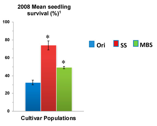 The greatest increase in survival was observed for “NuMex Crispy” (85.1%, P < 0.05), which had one of the lowest survival rates in its original population (31.4%) (Figure 3a). However, seedling survival rate of the MBS populations were not significantly higher than their original populations except “NuMex Chaco”, which exhibited an increase (original—32.4%, selected—49.3%, P < 0.05) in seedling survival (Figure 8). These results again indicate that a large amount of progress has been made in seeding stage with just one cycle of selection using the SS method.