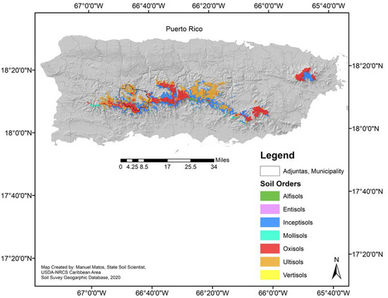 Land-area above 600 m in Puerto Rico and its predominant soil orders (Data and Map generated by Manuel Matos-Rodríguez, State Soil Scientist, USDA-NRCS Caribbean Area, 2019). This figure cannot be used in a publication before requesting authorization of Manuel Matos-Rodríguez.