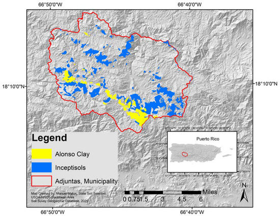- Muñoz, M.; Lugo, W.I.; Santiago, C.; Matos, M.; Ríos, S.; Lugo, J. Taxonomic Classification of the Soils of Puerto Rico, 2017; Bulletin 313; University of Puerto Rico, Mayagüez Campus: Mayagüez, Puerto Rico; College of Agricultural Sciences Agricultural Experiment Station: San Juan, Puerto Rico, 2018; 20p. [Google Scholar]
