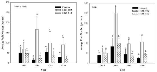 Total average fruit number (2013–2016) of ‘Marr’s Early’ and ‘Pera’ sweet oranges grafted on three different rootstocks growing in Alonso clay series soil at the Agricultural Experiment Substation of Adjuntas, Puerto Rico. Means ± standard error with the different letters for each scion and year are not significantly different by Tukey’s test at α < 0.05.