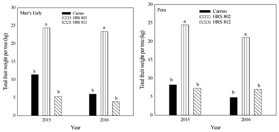 Between 2014 and 2016, ‘Pera’ scions grafted on ‘HRS 802’ had a higher number of fruit than those grafted on ‘HRS 812’ or ‘Carrizo’ (Figure 3). Also, a higher fruit number was found with ‘Marr’s Early’ grafted on ‘HRS 802’ compared with the other two combinations in 2014. No differences were found with other ‘Marr’s Early’ rootstock-scion combinations for the other years (Figure 3). Both scions grafted on ‘HRS 802’ rootstocks in the years 2015–2016 exhibited two-fold differences in total fruit weight per tree compared with the other combinations (Figure 4).