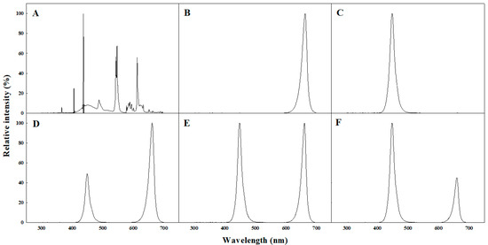 Relative spectral distribution of light used in a closed-type plant production system. (A) fluorescent lamp; (B) Red (red:blue = 10:0); (C) Blue (red:blue = 0:10); (D) R7B3 (red:blue = 7:3); (E) R5B5 (red:blue = 5:5); and (F) R3B7 (red:blue = 3:7).
