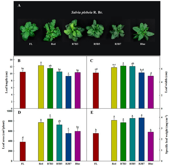 The leaf characteristics of Salvia plebeia R. Br. as affected by various light treatment at 35 days after transplanting are shown in Figure 2A. The leaf growth characteristics, such as leaf length, leaf width, leaf area, and SLW, tended to be higher in the treatments with a high ratio of red to blue light, such as Red and R7B3; in the treatments with a high ratio of blue light, Blue and R3B7, these values were lower. The leaf length and leaf width were the greatest in Red and R7B3, at 12.3 and 6.4 cm, respectively (Figure 2B,C). Similarly, the leaf area was the largest in R7B3 at 843.7 cm2, and the smallest in FL (control) at 382.0 cm2 (Figure 2D). The SLW, representing leaf thickness, was the lowest in FL and Blue (Figure 2E). Red light is known to develop the chlorophyll by stimulating phytochrome, which is a photoreceptor that plays an essential role in the growth and development of plants [37,38]. Although the effect of light quality on plant growth and morphology may vary depending on plant species, many studies have shown that red light elongates the plant and blue light inhibits plant height [39,40]. In this study, red light promoted leaf growth. In addition, Salvia splendens F. exhibited increased leaf area, plant height, and shoot dry weight in monochromatic red light compared to monochromatic blue light [41].