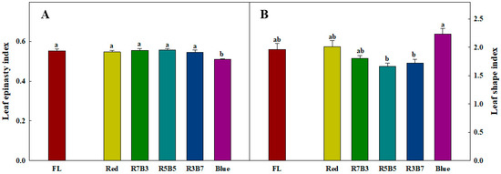 Leaf epinasty index (A) and leaf shape index (B) of Salvia plebeia R. Br. as affected by different light treatments at 35 days after transplanting. Vertical bars represent the standard deviation from the mean (n = 3). Different letters in the same column indicate significant differences based on Tukey’s multiple range test (α ≤ 0.05).
