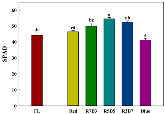 The soil-plant analysis development (SPAD) value, which indicates chlorophyll content, is shown in Figure 4. The SPAD value was the highest in R5B5 at 54.5 and the lowest in Blue at 41.2. Red and blue light influence energy provision, the accumulation of pigments, such as chlorophyll and carotenoid, secondary pigments involved in photosynthetic CO2 fixation, and basic metabolism [50,51]. The chlorophyll content of Brassica oleracea var. italica L. (kale) and Brassica oleracea var. acephala DC (broccoli) grown under monochromatic blue light was reported to be reduced [52,53]. In contrast, other studies have reported that blue light increased the chlorophyll content of lettuce and Brassica pekinensis Rupr. (Chinese cabbage) [23,31]. The chlorophyll content affected by light quality was indicated depending on varieties. To investigate the photosynthetic ability of Salvia plebeia R. Br. under the different light treatments, the photosynthetic rate, stomatal conductance, transpiration rate, and intercellular CO2 concentration were measured at 35 days after transplanting.
