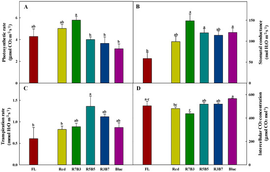 The photosynthetic rate was significantly higher in R7B3 at 5.7 μmol CO2 m−2∙s−1. Blue had the lowest photosynthetic rate, only 54% of that of R7B3 (Figure 5A). The stomatal conductance and transpiration rate were lower in FL compared with LED treatments (Figure 5B,C). The intercellular CO2 concentration was the opposite of the photosynthetic rate: Blue was 1.3 times more than R7B3 (Figure 5D).
