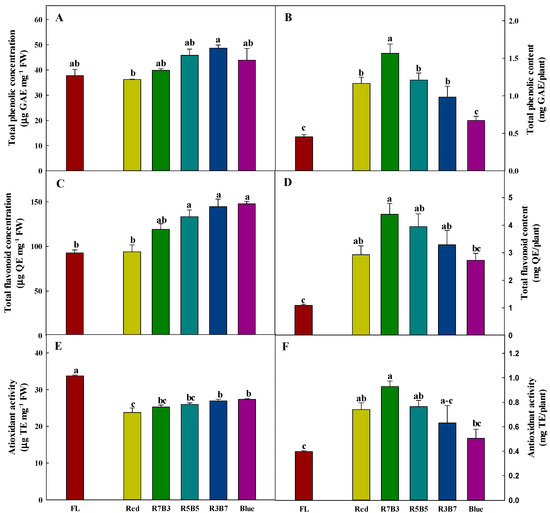Total phenolic and total flavonoid concentration, and antioxidant activity, per fresh weight (A), (C), and (E), respectively) and total phenolic and total flavonoid content, and antioxidant activity, per plant (B), (D), and (F), respectively) of Salvia plebeia R. Br. as affected by different light treatments at 35 days after transplanting. Vertical bars represent the standard deviation from the mean (n = 3). Different letters in the same column indicate significant differences based on Tukey’s multiple range test (α ≤ 0.05).