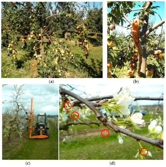 (a) Overloaded plum tree (top left), (b) which can lead to branch breakage (top right); (c) mechanical thinning in plum cv. “Ortenauer”, using the Bonner thinning device (‘BAUM’) with three rotors and adapted to the spindle tree (bottom left); and (d) individual flowers mechanically removed from the branch (red circles, bottom right) in a commercial orchard near Bonn (Photos © M. Blanke, Bonn).