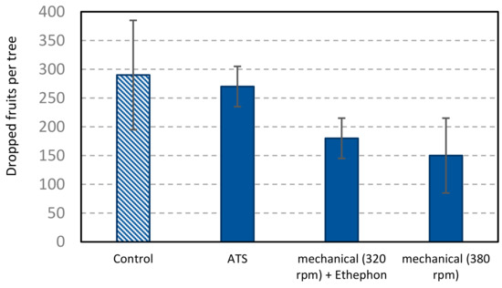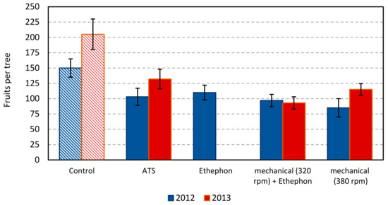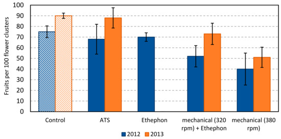 Crop load regulation by mechanical blossom thinning, as an innovative technology, reduced fruit set—Viz., the number of fruit—from 75 plums in 2012 and from 90 plums per 100 flowers in 2013 to 40 fruit in 2012 and to 52 fruit in 2013 after mechanical thinning at 380 rpm (Figure 2). The chemical thinning at full bloom with ATS showed no statistically significant effect on fruit set at this early stage of fruit development.