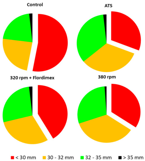 Crop load management (CLM) dramatically reduced the number of small undersized fruits at harvest: from 53% in the un-thinned control to 41% after mechanically thinning at 320 rpm, and from 34% at 380 rpm to 31% with ATS (Figure 5). The sugar content and fruit firmness were not affected by any of the treatments (results not shown).
