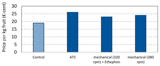 All the CLM treatments reduced the proportion of undersized, small fruits (Figure 5). The combination of mechanical and chemical thinning (ethephon 30 days after flowering) improved financial returns (to 23 cents per kg of fruit) relative to the un-thinned control (19 Euro cents per kg of fruit), based on the proportions of fruit sizes. Chemical thinning with ATS at flowering improved the return to 26 Euro cents per kg of fruit; mechanical thinning at 380 rpm at flowering improved the return to 24 Euro cents per kg (Figure 6). Manual thinning may improve fruit size, but the required range of 30–90 h/ha may increase labour costs, thereby decreasing the financial returns [11]. With the mechanical thinning (ca. EUR 110/ha), a portion of the labour costs in the order of EUR 300–900/ha/year can be saved, assuming a labour cost of EUR 10/h as in Western Europe.