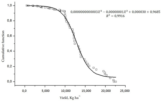Cumulative function of data of yield (kg ha−1) in vineyards (n = 63).