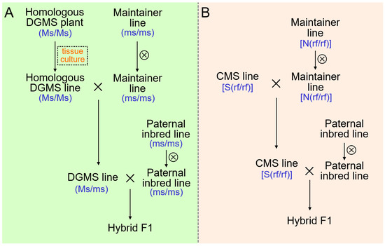 Two strategies of hybrids’ production with male sterility in B. oleracea crops. (A) Hybrids production strategy with dominant genic male sterility (DGMS) (Ms, dominant male sterile gene; ms, male fertile gene that is the allele of Ms). (B) Hybrids production strategy with Ogura CMS (S, mitochondrial sterile gene; N, mitochondrial sterile gene; rf, recessive nuclear sterile gene of Ogura CMS). The symbol × represents hybridization and ⊗ represents selfing.