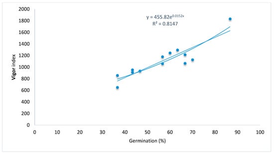 Relationship between the vigor index and germination (%) of the Yard-long bean.