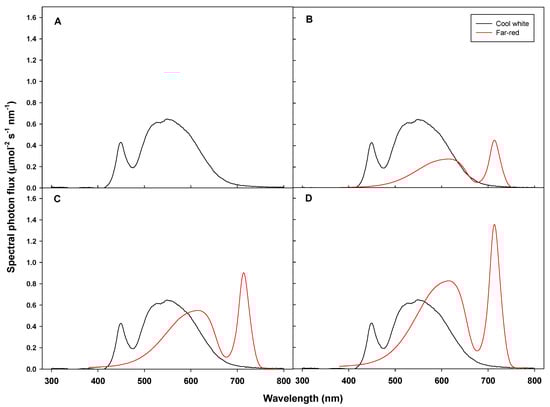 In each treatment, the far-red-enriched LEDs were on at the same time as the cool white LEDs, creating four different phytochrome photostationary state (PSS) values. The average quantum per 1-nm wavelength of each treatment from 300 to 800 nm was collected at 12 points using a LI-190 quantum sensor (LI-COR Inc., Lincoln, NE). The estimated PSS of each treatment was calculated from the spectral distribution data following the method of Sager [27]: