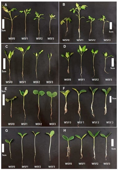 Seedlings of tomato “Dotaerangdia” (A) and “B-blocking” (B) at 14 days after sowing (DAS), red pepper “Shinhong” (C) and “Tantan” (D) at 14 DAS, cucumber (E) and gourd (F) at 7 DAS and watermelon (G) and bottle gourd (H) at 9 DAS under the different supplemental far-red-enriched LED treatments. The treatments were cool white LED:far-red LED at ratios of 5:0, 5:1, 5:2 and 5:3, or W5F0, W5F1, W5F2 and W5F3, respectively.