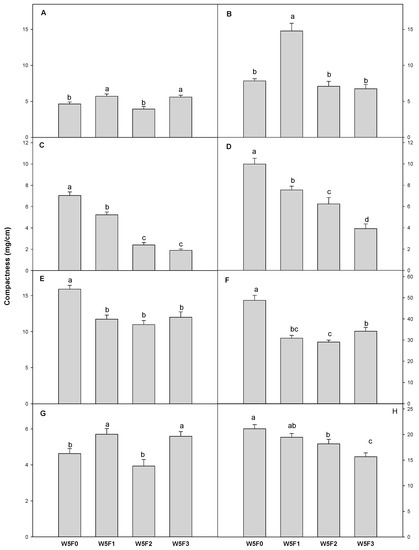 Supplemental far-red-enriched lights influenced the compactness of seedlings differently depending on plant species (Figure 3). Compactness is the ratio of the shoot dry weight and hypocotyl length, and higher compactness indicates the seedlings were short and denser [33]. The compactness of the “Dotaerangdia” tomato under W5F1 and W5F3 was higher than W5F0. In contrast, the compactness of the “B-blocking” tomato was the greatest under W5F1. However, the compactness of red pepper seedlings showed a clear declining trend as far-red-enriched light intensity increased. The compactness of cucumber and gourd was decreased significantly by the supplemental far-red-enriched lights, regardless of the light intensity. The compactness of watermelon under W5F1 and W5F3 was higher than W5F0, while that of bottle gourd was decreased as far-red-enriched light intensity increased.
