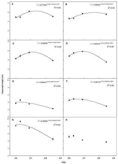 The hypocotyl length of each plant responded differently to PSS values and generally resulted in a quadratic regression and a peak value (Figure 4). Maximum hypocotyl lengths of tomato “Dotaerangdia” and “B-blocking” were 6.27 cm at PSS 0.73 and 6.00 cm at PSS 0.77, respectively. Maximum hypocotyl lengths of red pepper were 5.68 cm at PSS 0.71 for “Shinhong” and 5.58 cm at PSS 0.69 for “Tantan”. In the case of cucumber, maximum hypocotyl length was 4.06 cm at PSS 0.61; for gourd, it was 4.86 cm at PSS 0.66. The maximum hypocotyl length of watermelon was 8.59 cm at PSS 0.60, while bottle gourd did not show a significant quadratic regression.