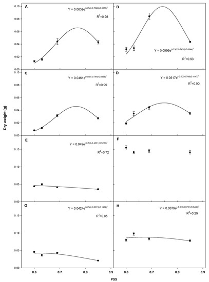 The dry weight of each plant responded differently to PSS values (Figure 5). Although there were highly significant quadratic relationships for tomato and red pepper seedlings, cucumber, gourd, watermelon and bottle gourd seedlings did not show clear relationships of dry weight to PSS values. The maximum dry weight of the “Dotaerangdia” and “B-blocking” tomato was 0.066 g at PSS 0.77 and 0.100 g at PSS 0.74, respectively. For red pepper, the maximum dry weight was 0.046 g at PSS 0.77 for “Shinhong” and 0.052 g at PSS 0.75 for “Tantan”.