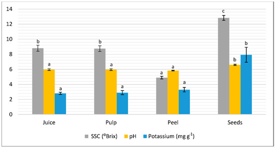 About potassium concentration (Figure 1), seeds showed the highest value, (7.93 ± 0.10) mg g−1. In the remaining parts, the concentration was not significantly different (2.80 ± 0.15, 2.90 ± 0.27 and 3.29 ± 0.30 mg g−1, respectively in juice, pulp and peel).