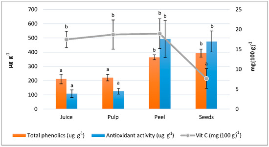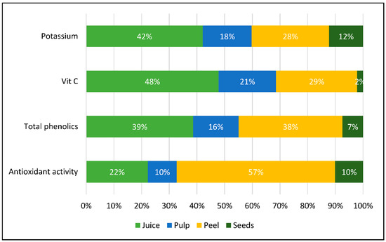 Peel and seeds contribute with 67% of antioxidant activity and contain 45% of total phenolics, 31% of vitamin C, and 40% of all potassium content. Although seeds had the highest potassium content (Figure 1), they account for only 12% of the total amount of mineral included in the whole fruit. Concerning vitamin C, juice and pulp have the highest value, being 48% in juice and 21% in pulp; seeds have a poorer contribution (around 2%). Total phenolics were similar in edible and non-edible parts. Juice and peel are the primary sources contributing to 39% and 38%, respectively. Peel stood out for representing 57% of the total antioxidant activity, which was the highest value observed.