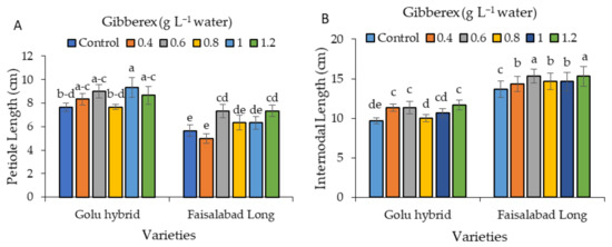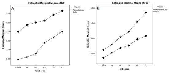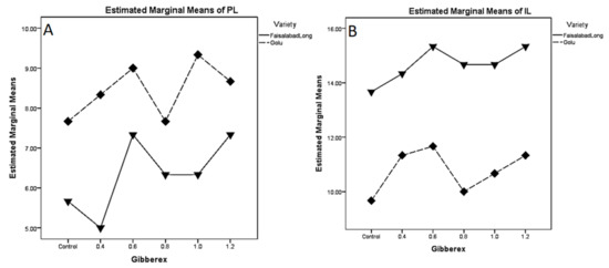 Results indicated that gibberex application as treatment significantly (p ≤ 0.05) increased the internodal length (IL) and petiole length (PL) of Golu hybrid and Faisalabad Long (Figure 1A,B). Interaction of different application rates of gibberex and varieties of bitter gourd was ordinal for petiole length (Figure 2A). A positive non-significant correlation was observed between petiole length of Golu hybrid and Faisalabad Long with different application rates of gibberex (Figure 2A). Application of treatment 1.0 gL−1 gibberex remained significant as compared to control in Golu hybrid for petiole length. In Faisalabad Long, treatments 1.2 and 0.6 gL−1 gibberex showed a significant positive response for improvement in petiole length. Maximum petiole length (9.33 and 7.33 cm) was recorded in Golu hybrid and Faisalabad Long at 1.0 and 1.2 gL−1 gibberex respectively.