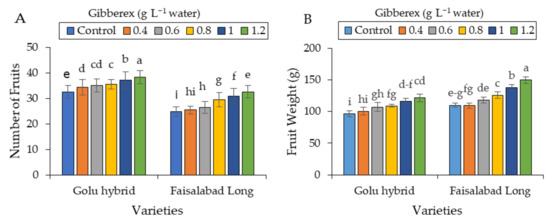Effect of different application rates of Gibberex was significant (p ≤ 0.05) on number of fruits (NF) (Figure 3A) and fruit weight (FW) (Figure 3B) of Golu hybrid and Faisalabad Long. Interaction of different application rates of Gibberex and varieties of bitter gourd was disordinal for number of fruits (Figure 4A). A positive significant correlation was observed between Golu hybrid and Faisalabad number of fruits with different application rates of gibberex (Figure 9A,B). It was noted that application of treatment 1.2 gL−1. Gibberex was significantly different as compared to other application rates of Gibberex for improvement in number of fruits of Golu hybrid and Faisalabad Long. However, number of fruits were significantly higher in Golu hybrid over Faisalabad Long. For the increase in fruit weight of Golu hybrid and Faisalabad Long, higher application rate 1.2 gL−1 Gibberex as treatment differed significantly from control. Interaction of different application rates of Gibberex and varieties of bitter gourd was significant ordinal for fruit weight (Figure 4B). A positive significant correlation was observed between Golu hybrid and Faisalabad fruit weight with different application rates of gibberex (Figure 9A,B). Maximum increase of 17.8 and 31.4% in number of fruits and 26.4 and 36.1% in fruit weight were noted where 1.2 gL−1 gibberex in Golu hybrid and Faisalabad Long respectively. Balance uptake of nutrients by application of Gibberex played an imperative role in the improvement of number of fruits and fruit weight in bitter gourd varieties [43]. Application of GA3 enhanced the synthesis of chlorophyll which led to enhanced production of proteins [46] whereas varietal genetic potential to produce a low or high number of fruits can also affect fruit number per plant. Moreover, Sadia et al. [47] concluded another factor that GA3 enhances the initial growth of ovaries along with reducing the abscission layer that leads to a reduction premature flower and fruit drop.