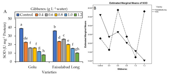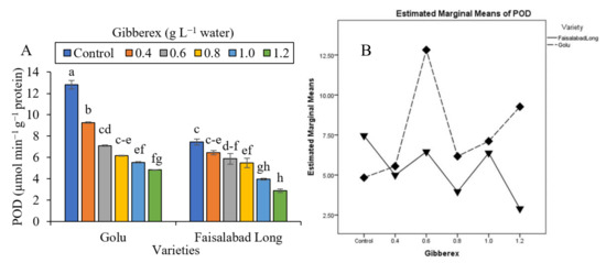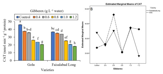 Effect of different application rates of gibberex significantly (p ≤ 0.05) affect the SOD (Figure 6A), POD (Figure 7A) and CAT (Figure 8A) in bitter gourd varieties. Interaction between different application rates of gibberex and bitter gourd varieties was significant ordinal for SOD (Figure 6B), POD (Figure 7B) and CAT (Figure 8B). A negative significant correlation was observed between Golu hybrid and Faisalabad SOD, POD and CAT with different application rates of gibberex (Figure 9A,B). Increasing levels of gibberex significantly decreased the SOD, POD and CAT in Golu hybrid and Faisalabad Long. Significant reductions in SOD (79% and 72%), POD (62% and 61%), and CAT (55% and 51%) were noted where treatment 1.2 gL−1 gibberex was applied in Golu hybrid and Faisalabad Long respectively. These findings are comparable with the outcomes of Rosenwasser et al. [53]. They also reported that exogenously applied GA3 reduced the production of reactive oxygen species and thus leads to improvement in the activity of SOD in Catharanthus roseus. Previous studies have concluded that GA3 application can enhance the antioxidant activity of plants by inducing phenolic production [54] reducing lipid peroxidation with increasing proline and glycine-betaine biosynthesis [55]. Previous studies have reported that plant growth regulators alone or in combination are involved in regulating the transcription of genes [56] along with mRNA [57] that ultimately, in turn, improve the synthesis of a specific hormone to make proteins.