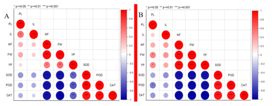 Pearson correlation between different application rates of gibberex and bitter gourd growth, yield and antioxidants. Figure (A) represents Golu hybrid and (B) represents Faisalabad Long. Red circles showed a positive correlation with attributes. Blue circles showed a negative correlation with attributes. * Significant (p ≤ 0.05), ** Highly significant (p ≤ 0.01) while results depicted that for yield per plant: Varieties = **, GA = **, Varieties × GA = **.