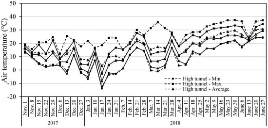 Daily minimum, average, and maximum air temperatures in the high tunnel and outdoors from November 2017 to June 2018 in Starkville, Mississippi. Air temperatures in the high tunnel were recorded using a temperature and relative humidity sensor (HOBO S-THB-M002; Onset Computer Corp.); local outdoor air temperature data were obtained from the United States Department of Agriculture (USDA) Natural Resources Conservation Service website.