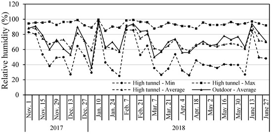 Daily minimum, average, and maximum relative humidity (RH) in the high tunnel and daily average RH outdoors from November 2017 to June 2018 in Starkville, Mississippi. Relative humidity in the high tunnel was recorded using a temperature and relative humidity sensor (HOBO S-THB-M002; Onset Computer Corp.); local outdoor RH data were obtained from the USDA Natural Resources Conservation Service website.