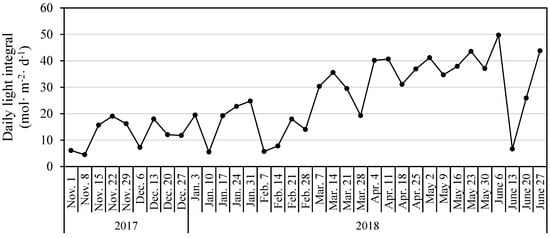 Daily light integral (DLI) in the high tunnel from November 2017 to June 2018 in Starkville, Mississippi. Daily light integral in the high tunnel was calculated by averaging photosynthetically active radiation (PAR) readings during a day and multiplying by 0.0864. PAR was recorded using a quantum sensor (HOBO S-LIA-M003; Onset Computer Corp.) at 15 min intervals connected to a data logger (HOBO Micro Station H21-002; Onset Computer Corp.).