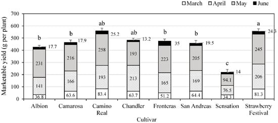 During the 2017 to 2018 growing season, the marketable strawberry yield of seven cultivars increased from March to May, peaked in May, decreased and ended in early June, except for “Chandler” peaking in April (Figure 4). “Camino Real” and “Strawberry Festival” produced the highest early marketable yields of 83.4 and 81.3 g per plant in March, higher than “Chandler”, “Camarosa”, “Fronteras”, “Albion”, or “Sensation”, producing March yields of 34.3 g to 63.7 g per plant. In April, “Chandler” and “Strawberry Festival” produced the highest marketable yields of 213 g and 206 g per plant, respectively, higher than “Camarosa”, “Fronteras”, “Albion”, or “Sensation”, producing marketable yield of 76.5 g to 166 g per plant. Five cultivars “Camino Real”, “Strawberry Festival”, “Albion”, “Fronteras”, and “Camarosa” produced similar marketable yields in May, ranging from 216 g to 258 g per plant, higher than “Sensation” producing 94.1 g marketable yield per plant. “Sensation” had the lowest marketable yield among cultivars from March to May. “Fronteras” produced the highest marketable yield of 35.0 g per plant in June, with all other cultivars having generally comparable marketable yield ranging from 13.2 g to 25.2 g per plant. “Camino Real”, “Chandler”, and “Strawberry Festival” had similar highest total marketable yields of 559 g, 483 g, and 555 g per plant, respectively. “Albion”, “Camarosa”, “Fronteras”, and “San Andreas” had comparable total marketable yield of 427 g to 475 g per plant. “Sensation” had the lowest total marketable yield of 216 g per plant.