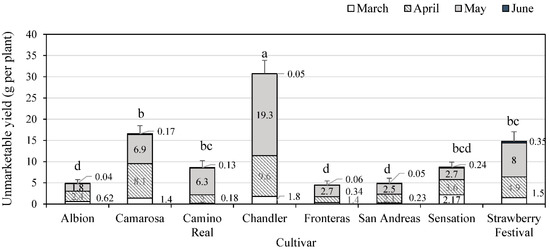 Monthly and total unmarketable yield of six June-bearing (“Camarosa”, “Camino Real”, “Chandler”, “Fronteras”, “Sensation”, and “Strawberry Festival”) and two day-neutral (“Albion” and “San Andreas”) strawberry cultivars grown with black or red plastic mulches in a high-tunnel production system in Starkville, Mississippi from November 2017 to June 2018. Strawberry fruits that were misshapen, disease- or insect-damaged, or below 10 g were considered unmarketable yield. Different lowercase letters on top of each bar indicate a significant difference in total unmarketable yield among cultivars using Tukey’s HSD test at p ≤ 0.05.