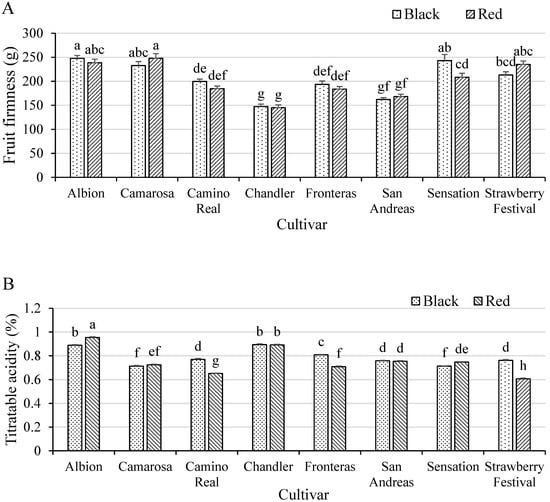 Strawberry fruit firmness (A) and titratable acidity (B) affected by the interaction between cultivar and mulch type grown in a high tunnel in Starkville, Mississippi from November 2017 to June 2018. Six June-bearing (“Camarosa”, “Camino Real”, “Chandler”, “Fronteras”, “Sensation”, and “Strawberry Festival”) and two day-neutral (“Albion” and “San Andreas”) strawberry cultivars were grown with black or red plastic mulches in a high tunnel production system. Different lowercase letters on top of each bar indicate a significant difference among all treatment combinations using Tukey’s HSD test at p ≤ 0.05.