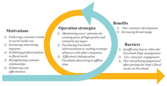 This study explored the status quo of social media adoption among florists located in Taiwan in terms of florists’ motivations, implementation strategies, perceived effectiveness, and barriers faced. All the findings regarding the motivation, strategies, benefits, and barriers for the adoption of social media in the flower retailing business are summarized in Figure 1.