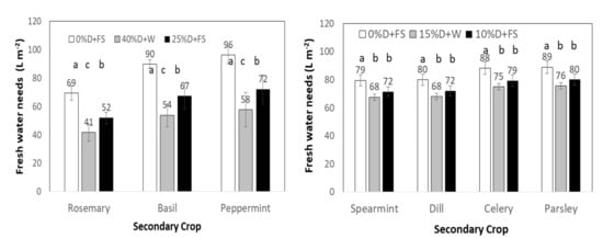 Total needs of fresh water (L m−2) of the secondary crops during the (a) 1st and (b) 2nd Periods, respectively. The mean value is above each bar. Different letters within crops indicate statistically significant differences (p < 0.05).