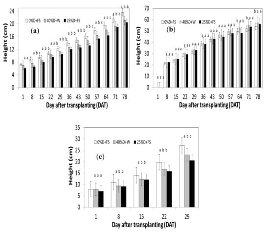 The mean height (cm) of the (a) rosemary, (b) basil and (c) peppermint during the 1st Period. The error bars represent the standard deviation of the means. Different letters within DAT indicate statistically significant differences (p < 0.05).