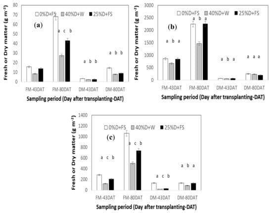 Figure 3 presents the mean fresh (FM) and dry (DM) matter values of the biomass of the secondary crops observed at DAT 43 and 80 during the 1st Period. It can be seen that rosemary produced the highest FM under the 0%D+FS treatment (68 g m−2) while the FM in 25%D+FS and 40%D+W treatments was 36% and 60% lower than the control treatment, respectively. Similar reductions in the FM were also observed in the peppermint plants cultivated under the same treatments. In the case of basil plants, the FM values observed were similar under the 0%D+FS and 25%D+FS treatments while the values observed under the 40%D+W treatment were about 35% lower than the control ones.