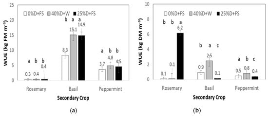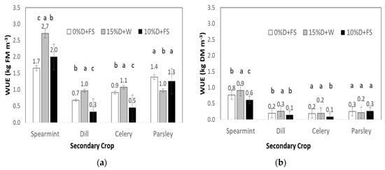 Water use efficiency (WUE, kg m−3) based on (a) Fresh matter (FM) and (b) Dry matter (DM) of the secondary crops (Spearmint, Dill, Celery, Parsley) studied during the 2nd experimental period. Different letters above bars within crops indicate statistically significant differences (p < 0.05).
