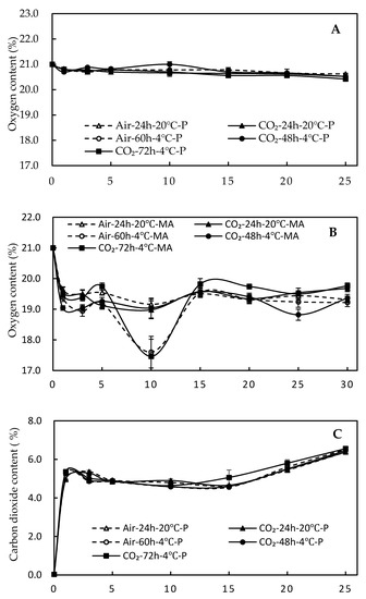 The atmospheric conditions in packages affect fresh produce qualities, such as flavor, color, firmness, sugar, pH, and acidity [24]. A modified atmosphere (MA) package modifies the gas environment in packages by allowing oxygen transmission through the film. The content of O2 in packages reached equilibrium after one day of storage and stabilized at nearly 21% in P packages and 19% in MA packages (Figure 1A,B). Atmospheric composition in MA packages was modified during the storage period, and no significant differences among prepackaging treatments were observed within the same package type. The atmospheric composition determines the respiration rate of the harvested produce, thereby causing deterioration [25]. The content of O2 in packages depends only on packaging film, signifying that high-CO2 treatments cause no irreparable damage to asparagus. An O2 content higher than 5% is better for asparagus cold storage [26]. Likewise, an O2 below 5–10% is harmful to green asparagus and leads to an accumulation of ethanol, which can cause alcoholic off-flavors [27].