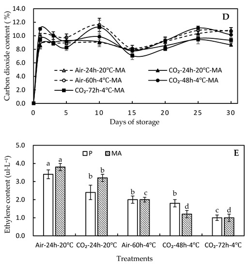 Changes in oxygen (A,B), carbon dioxide (C,D), and ethylene (E) contents in perforated (P) and modified atmosphere (MA) packages. (A,C): Perforated packages; (B,D): 10,000 cc/m2∙day∙atm oxygen transmission rate (OTR)-modified atmosphere packages (MA). Treatments were 60% CO2 or air for 24 h at 20 °C, 60% CO2 for 48 or 72 h, or air for 60 h at 4 °C. All the groups were packaged and stored at 4 °C until the final day. Values are presented as means ± SE (n = 5). Different letters among the same packaging types indicate a statistical difference using an LSD (Least Significant Difference) test at p < 0.05.