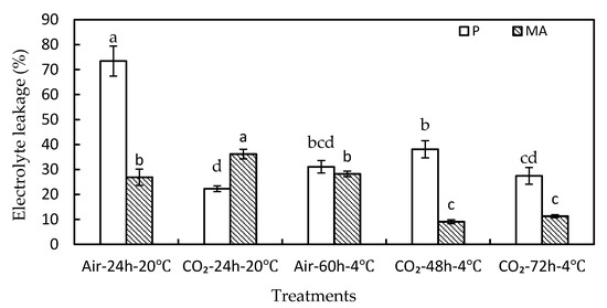 Electrolyte leakage of green asparagus treated with 60% CO2 and air on the final storage day in P and MA packages. All groups were stored at 4 °C until the final day. Values are presented as means ± SE (n = 5). Different letters among the same packaging types indicate statistical difference using an LSD (Least Significant Difference) test at p < 0.05.