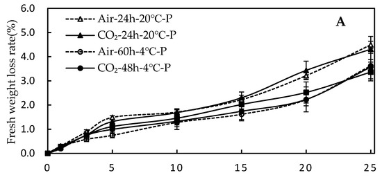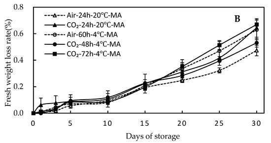 Changes in fresh weight-loss rate of green asparagus treatments with 60% CO2 packaged with MA and P films. (A) Perforated packages (P); (B) 10,000 cc/m2∙day∙atm oxygen transmission rate (OTR)-modified atmosphere packages (MA). All groups were stored at 4 °C until the final day. Values are presented as means ± SE (n = 5).