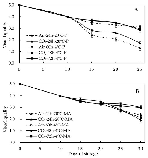 Visual quality is the main consideration for consumers in purchasing asparagus. Characteristics of asparagus quality loss, such as longitudinal striation, bract opening, turgidity, base desiccation, color changes, and microorganism spoilage, were observed. By prolonging the storage time, the visual quality of asparagus decreased in all treatments (Figure 5). Air-60 h-4 °C-P and CO2-48 h-4 °C-MA treatments maintained marketable quality, with scores higher than 3.0 after 25 days of storage. Treatments at 20 °C yielded the worst visual quality in both MA and P packages. High CO2 treatments at 4 °C inhibited visual quality deterioration. The high-CO2 treatment was effective in maintaining table grape (V. vinifera L. cv. Autumn Royal) quality, reducing strawberry water loss (Fragaria vesca L. cv. Mara de Bois), and inhibiting total decay [52,53,54].