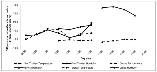 In Sint-Truiden, the relative humidity was increased by an average of 8% for 3 h prior to spraying. However, as described above, the relative humidity was also increased during the 1 h after spraying, from 48.6% to 68.6%. Along with the relative humidity increase, there was an average temperature increase of 7.5 °C (Figure 1). In the case of Lleida and Girona, the relative humidity was raised 13.7% and 35.3%, respectively, and the temperature inside the structure was 1 °C less in both locations.