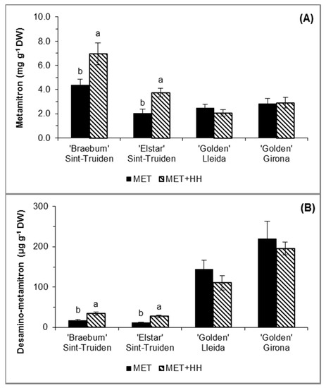 These characteristics may also explain the higher concentration of metamitron in leaves from the combined treatment (MET+HH) observed in both cultivars in Sint-Truiden, but not in Lleida and Girona. The temperature increase that occurred only in Sint-Truiden (Figure 1) may have also influenced absorption. An increase in urea absorption was previously verified when the temperature was 28 °C compared to 19 °C [20]. In Sint-Truiden (‘Braeburn’ and ‘Elstar’), an increase in temperature occurred during the HH period, from 16 to 23 °C, which may additionally explain the contrast of no extra absorption caused by HH at Lleida and Girona. This may also be related to ‘Golden Reinders’ leaf characteristics, which may be less susceptible to morphological changes under different relative humidity conditions, producing more metamitron degradation.