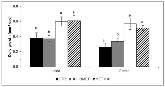 The increase of relative humidity (HH) did not alter the daily shoot growth rate; however, both MET and MET+HH treatments induced significant increases of 40% in ‘Golden Reinders’ at Lleida (both treatments), and 120% in MET, and 96% in MET+HH in Girona compared to the CTR (Figure 4).